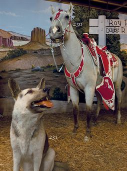 Trigger was not alone; Buttermilk (Dale Evans' horse) and Bullet (the Rogers' German Shepherd) are mounted alongside.