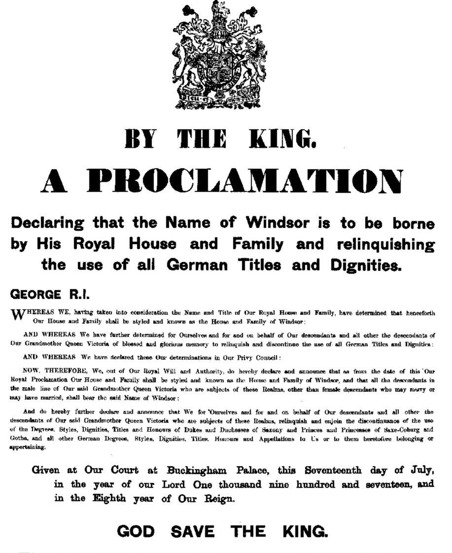 Britain's King George V issues a royal proclamation changing his family's surname from Saxe-Coburg and Gotha to Windsor.
