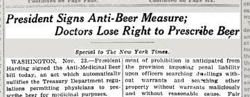 U.S. President Warren G. Harding signed the Willis Campbell Act, which prohibited the medical prescription of beer and liquor on this date.